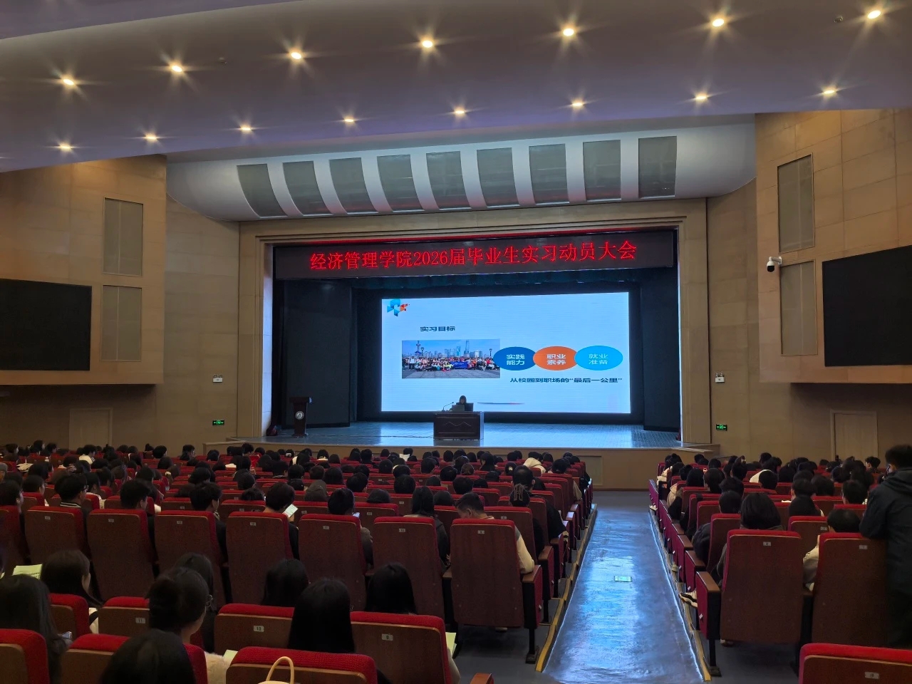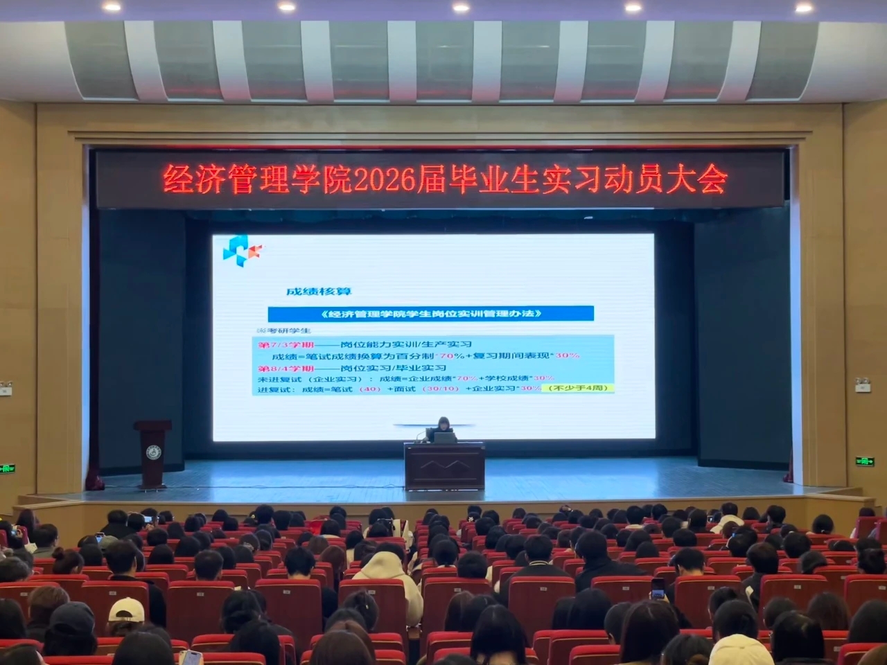 三、衔接职场未来 以行践知,以教促学。此次毕业实习动员大会,不仅彰显了经济管理学院对实践教学的高度重视,更有效调动了2026届学子的实习积极性。大会帮助同学们清晰地掌握实习工作安排,进一步增强了同学们到企业实习的责任感与自信心,为后续毕业生实习工作有序、高效开展提供有力保障。
